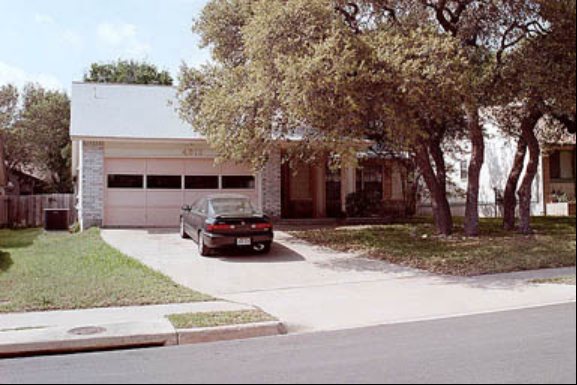A few steps into the street and looking back at the front door of the house. The snow on the live oaks is gorgeous! Compare to this shot...